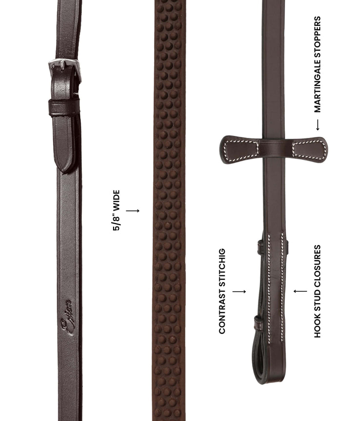 For added utility, the reins include martingale stoppers—a small but crucial detail that prevents the rings of a running martingale from sliding too far forward and interfering with the bit, ensuring both safety and clear rein aids.