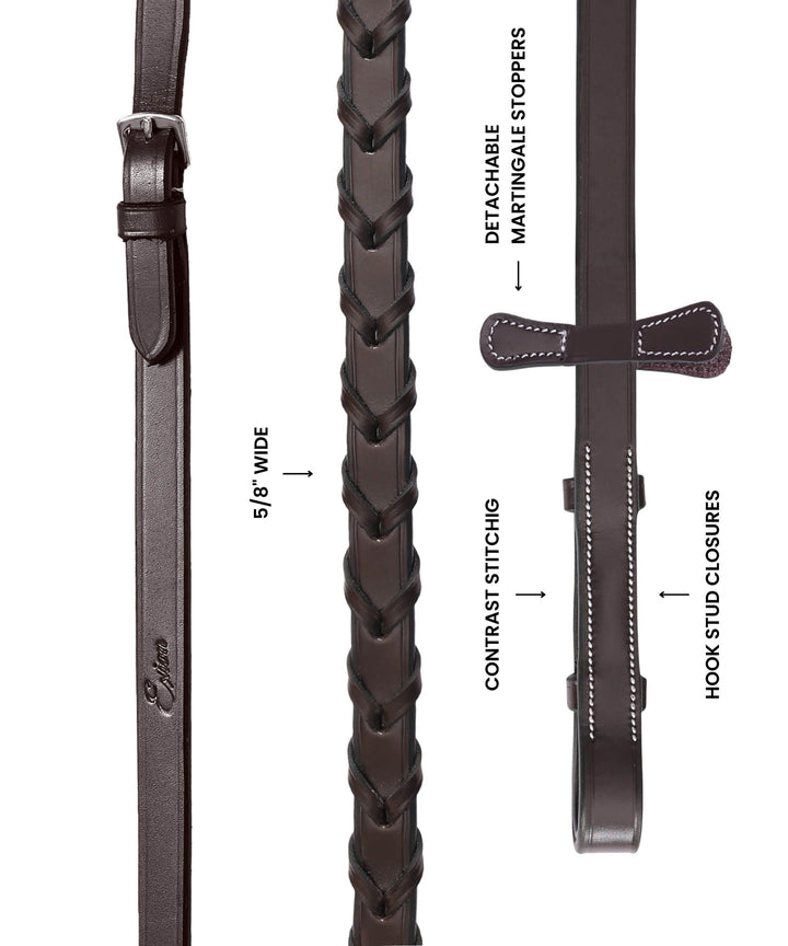 A standout feature of these laced english reins is the detachable martingale stoppers — a thoughtful addition that lets you easily remove them for hunter classes or reattach for show jumping or training sessions. This versatility makes them a favourite among riders who value both practicality and elegance.